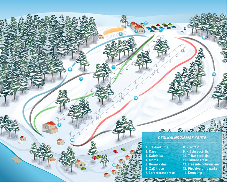Latvijā garākās kalnu slēpošanas un snovborda trases meklējamas Cēsu pievārtē – pie mums - SLĒPOŠANAS UN ATPŪTAS PARKĀ OZOLKALNS. Trašu reljefs ir maksimāli atstāts to dabiskajā izskatā, kas rada iespaidu, ka patiešām atrodies kalnos.